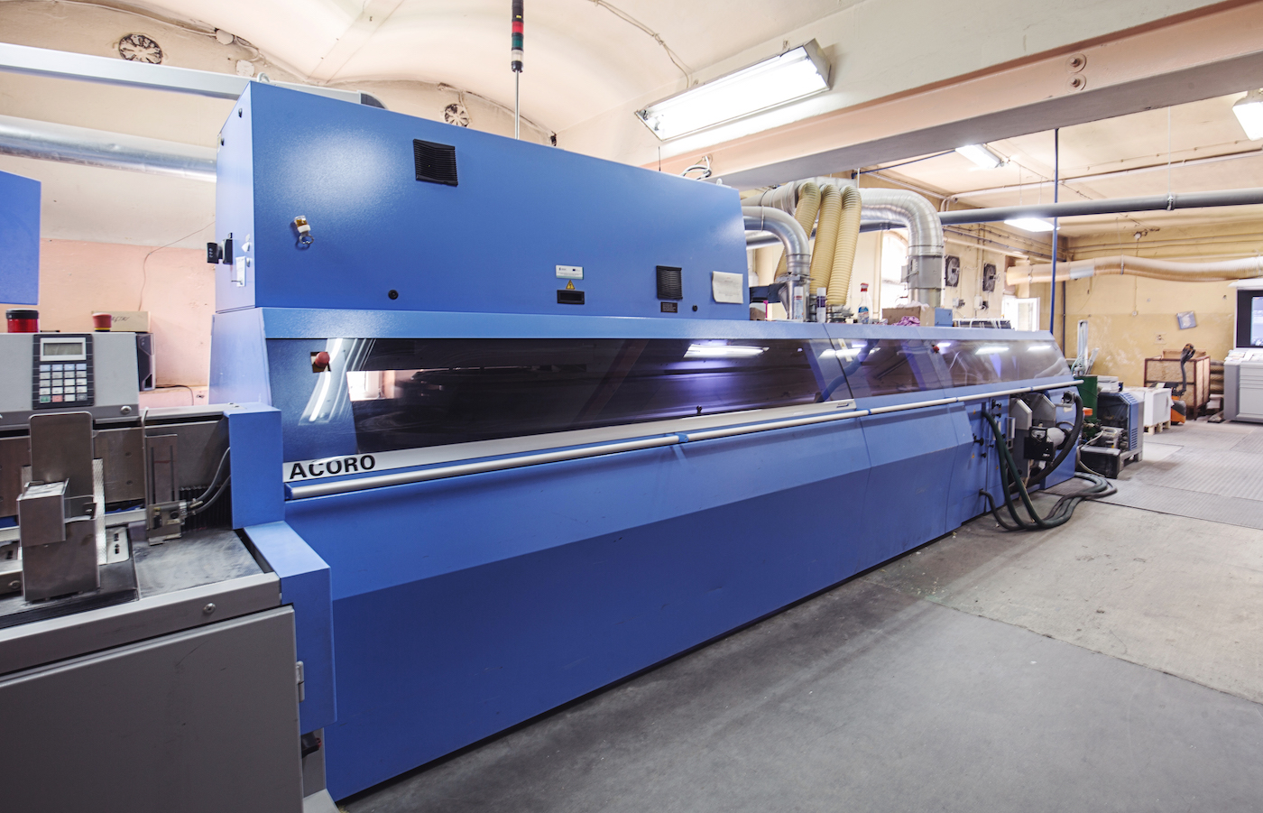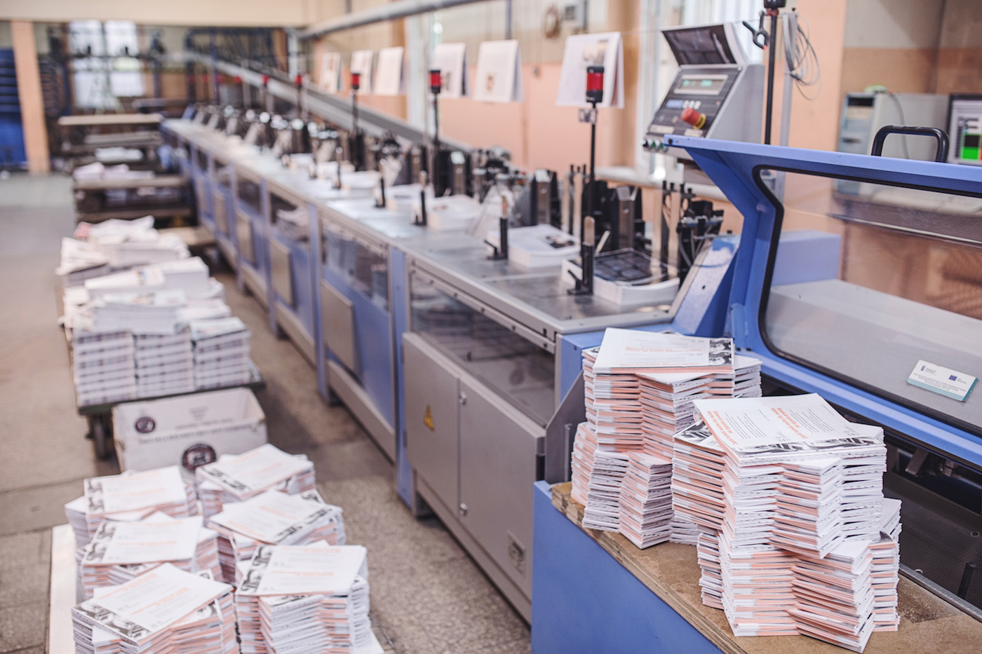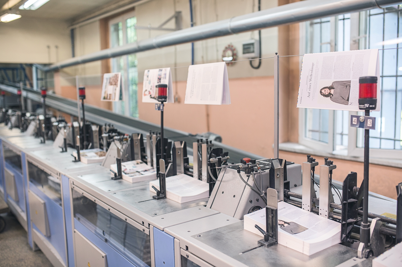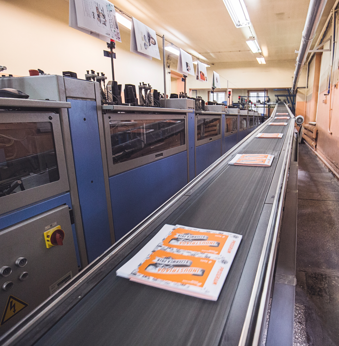 - Linia do oprawy klejonej ACORO Müller Martini z technologią PUR i Hot Melt (18 stacji samonakładających) z możliwością produkcji okładek ze skrzydełkami w linii